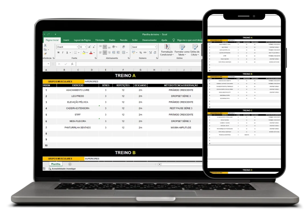 Transforme a forma como você organiza os treinos dos seus clientes! Nossa planilha de treino em Excel não só é profissional, mas também possui um design intuitivo que facilita o entendimento.